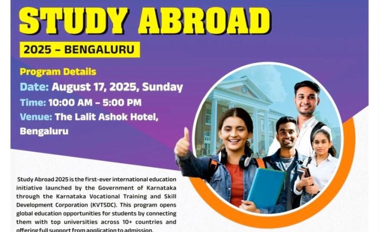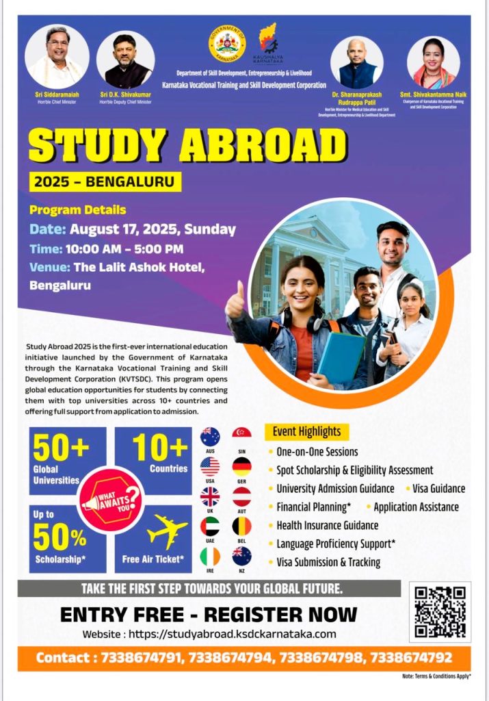 To encourage wider participation, the government is hosting a Study Abroad Expo at Hotel Lalit Ashok on Sunday, August 17. The event brings together over 60 international universities showcasing courses, scholarships, and career pathways tailored for Karnataka’s students.