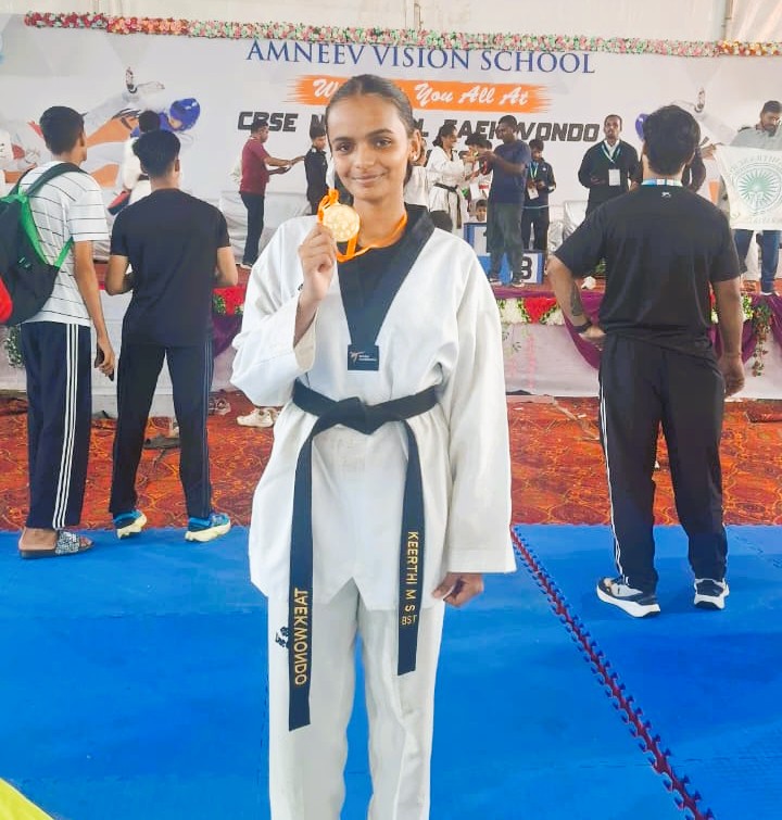 BENGALURU – Keerthi M.S., a fifteen-year-old student from Bengaluru, has soared to victory, securing a gold medal at the recent CBSE National Taekwondo Championship in Etawah, Uttar Pradesh. This significant win propels the 10th-grade prodigy from Vidya Sanskaar International Public School to the next level, as she becomes the sole representative from Karnataka under the CBSE board to compete at the upcoming School Games Federation of India (SGFI) tournament.